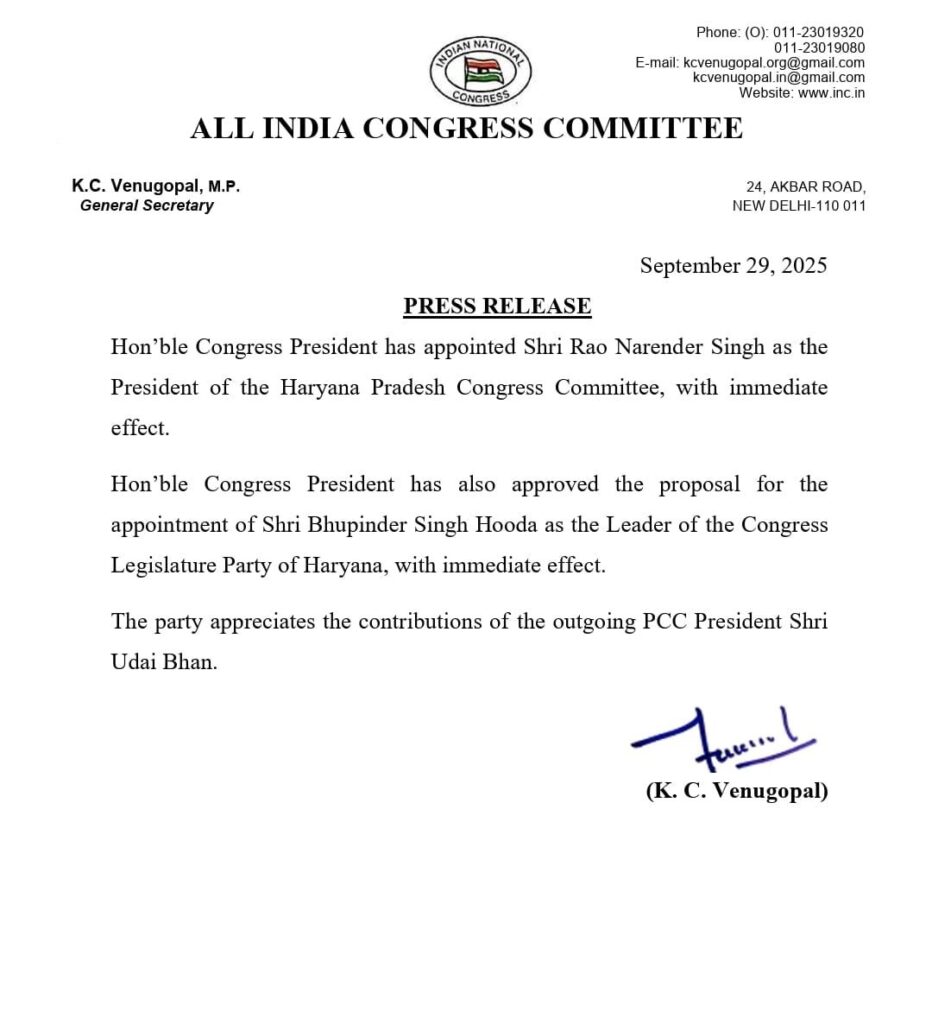 ਹਰਿਆਣਾ ਕਾਂਗਰਸ ਨੂੰ ਆਪਣਾ ਨਵਾਂ ਪ੍ਰਧਾਨ ਵੀ ਮਿਲ ਚੁੱਕਿਆ ਹੈ ਅਤੇ ਹੁਣ ਸੂਬਾ ਪ੍ਰਧਾਨ ਦੇ ਤੌਰ ਤੇ ਰਾਉ ਇੰਦਰ ਸਿੰਘ ਜਿੰਮੇਦਾਰੀ ਨਿਭਾਉਣਗੇ।