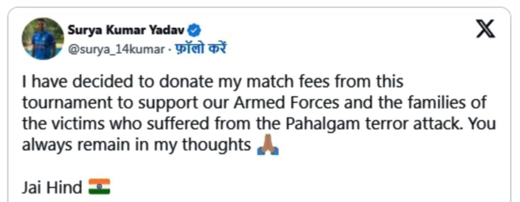 ਇਸ ਰੋਮਾਂਚਕ ਜਿੱਤ ਤੋਂ ਬਾਅਦ, 35 ਸਾਲਾ ਸੂਰਿਆਕੁਮਾਰ ਨੇ ਆਪਣੇ ਸੋਸ਼ਲ ਮੀਡੀਆ ਹੈਂਡਲ ‘ਤੇ ਲਿਖਿਆ, “ਮੈਂ ਇਸ ਟੂਰਨਾਮੈਂਟ ਤੋਂ ਆਪਣੀ ਮੈਚ ਫੀਸ ਸਾਡੀਆਂ ਹਥਿਆਰਬੰਦ ਫੌਜਾਂ ਅਤੇ ਪਹਿਲਗਾਮ ਅੱਤਵਾਦੀ ਹਮਲੇ ਦੇ ਪੀੜਤਾਂ ਦੇ ਪਰਿਵਾਰਾਂ ਦੇ ਸਮਰਥਨ ਲਈ ਦਾਨ ਕਰਨ ਦਾ ਫੈਸਲਾ ਕੀਤਾ ਹੈ। ਤੁਸੀਂ ਹਮੇਸ਼ਾਂ ਮੇਰੇ ਵਿਚਾਰਾਂ ਵਿੱਚ ਰਹੋਗੇ। ਜੈ ਹਿੰਦ।”