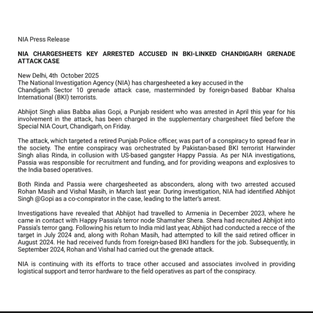 ਇਸ ਤੋਂ ਪਹਿਲਾਂ ਐਨਆਈਏ ਨੇ ਮਾਰਚ ਮਹੀਨੇ ਇਸ ਮਾਮਲੇ ਦੇ ਵਿੱਚ ਅਮਰੀਕਾ ‘ਚ ਮੌਜੂਦ ਗੈਂਗਸਟਰ ਤੇ ਅੱਤਵਾਦੀ ਬਣੇ ਹਰਪ੍ਰੀਤ ਸਿੰਘ ਉਰਫ ਹੈਪੀ ਪਾਸਿਆ ਅਤੇ ਪਾਕਿਸਤਾਨ ਚ ਬੈਠੇ ਅੱਤਵਾਦੀ ਹਰਵਿੰਦਰ ਸਿੰਘ ਰਿੰਦਾ ਦੇ ਖਿਲਾਫ ਚਾਰਜਸ਼ੀਟ ਦਾਖਲ ਕੀਤੀ ਸੀ। ਤੁਹਾਨੂੰ ਦੱਸ ਦਈਏ ਕਿ 11 ਸਿਤੰਬਰ 2024 ਨੂੰ ਚੰਡੀਗੜ੍ਹ ਦੇ ਸੈਕਟਰ 10 ਦੇ ਵਿੱਚ ਇੱਕ ਘਰ ਦੇ ਉੱਤੇ ਗ੍ਰੇਨੇਡ ਹਮਲਾ ਹੋਇਆ ਸੀ ਜਿੱਥੇ ਸਾਬਕਾ ਪੰਜਾਬ ਪੁਲਿਸ ਦੇ ਅਧਿਕਾਰੀ ਦੀ ਜਾਨ ਲੈਣ ਦੀ ਕੋਸ਼ਿਸ਼ ਕੀਤੀ ਗਈ ਸੀ।।