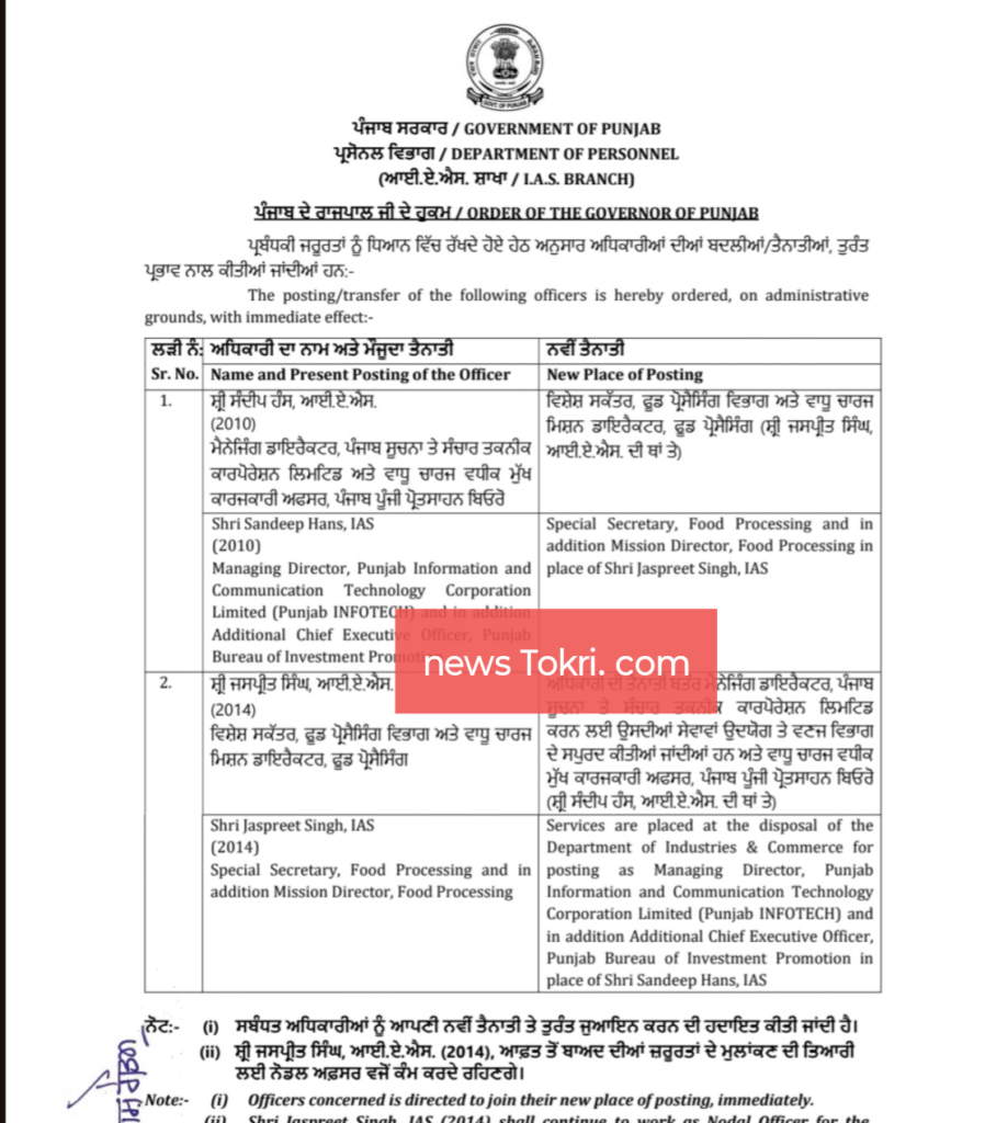 HomeIAS Transfer: 2 IAS ਅਧਿਕਾਰੀਆਂ ਦੀ ਹੋਈ ਟ੍ਰਾਂਸਫਰ, ਪੜ੍ਹੋ ਕਿੱਥੇ ਕਿਸਨੂੰ ਕਿ ਜਿੰਮੇਦਾਰੀ ਮਿਲੀ IAS Transfer: 2 IAS ਅਧਿਕਾਰੀਆਂ ਦੀ ਹੋਈ ਟ੍ਰਾਂਸਫਰ, ਪੜ੍ਹੋ ਕਿੱਥੇ ਕਿਸਨੂੰ ਕਿ ਜਿੰਮੇਦਾਰੀ ਮਿਲੀ byNews Tokri ਪੰਜਾਬ ਦੇ ਰਾਜਪਾਲ ਦੇ ਹੁਕਮਾਂ ਅਨੁਸਾਰ ਦੋ ਆਈਐਸ ਅਧਿਕਾਰੀਆਂ ਦੀ ਨਵੀਂ ਜਗ੍ਹਾ ਟ੍ਰਾਂਸਫਰ ਅਤੇ ਪੋਸਟਿੰਗ ਕੀਤੀ ਗਈ ਹੈ। Share this:Share Click to share on Facebook (Opens in new window) Facebook Click to share on X (Opens in new window) X Click to email a link to a friend (Opens in new window) Email Click to share on Telegram (Opens in new window) Telegram Click to share on WhatsApp (Opens in new window) WhatsApp Spread the love