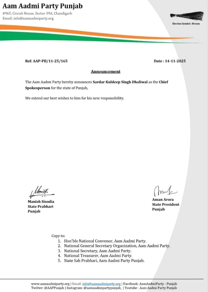 * เจจเจตเฉเจ เจเจผเจฟเฉฐเจฎเฉเจตเจพเจฐเฉ: เจเฉเจฒเจฆเฉเจช เจธเจฟเฉฐเจ เจงเจพเจฒเฉเจตเจพเจฒ เจจเฉเฉฐ เจชเจพเจฐเจเฉ เจฆเจพ เจฎเฉเฉฑเจ เจฌเฉเจฒเจพเจฐเจพ (Chief Spokesperson) เจจเจฟเจฏเฉเจเจค เจเฉเจคเจพ เจเจฟเจ เจนเฉเฅค