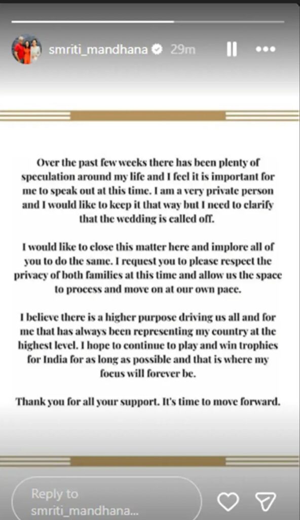 рд╕реНрдореГрддрд┐ рдордВрдзрд╛рдирд╛ рдиреЗ рдЕрдкрдиреЗ рдкреЛрд╕реНрдЯ рдореЗрдВ рд▓рд┐рдЦрд╛ рдХрд┐ рдкрд┐рдЫрд▓реЗ рдХреБрдЫ рд╣рдлреНрддреЛрдВ рд╕реЗ рдореЗрд░реА рдЬрд┐рдВрджрдЧреА рдХреЛ рд▓реЗрдХрд░ рдмрд╣реБрдд рд╕рд╛рд░реА рдЕрдЯрдХрд▓реЗрдВ (Speculations) рд▓рдЧрд╛рдИ рдЬрд╛ рд░рд╣реА рд╣реИрдВ, рдФрд░ рдЕрдм рдЗрд╕ рдкрд░ рдмрд╛рдд рдХрд░рдирд╛ рдЬрд╝рд░реВрд░реА рд╣реИред