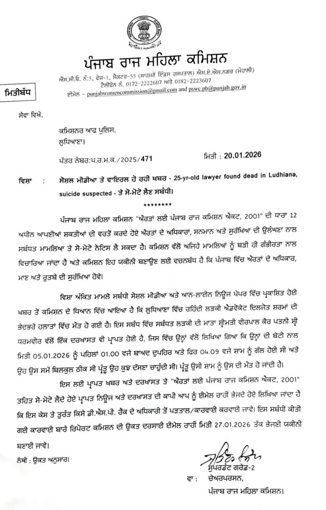 LUDHIANA: ਕੁਝ ਦਿਨ ਪਹਿਲਾਂ ਲੁਧਿਆਣਾ ਦੀ ਰਹਿਣ ਵਾਲੀ Advocate Diljot Sharma ਦੀ ਹੋਈ mysterious death (ਭੇਦ ਭਰੇ ਹਾਲਾਤਾਂ ਵਿੱਚ ਮੌਤ) ਦੇ ਮਾਮਲੇ ਨੇ ਹੁਣ ਨਵਾਂ ਮੋੜ ਲੈ ਲਿਆ ਹੈ। ਇਸ ਮਾਮਲੇ ਵਿੱਚ ਪਰਿਵਾਰ ਵੱਲੋਂ ਲਗਾਏ ਗਏ ਇਲਜ਼ਾਮਾਂ ਅਤੇ ਸ਼ਿਕਾਇਤ ਤੋਂ ਬਾਅਦ Punjab Women’s Commission (ਪੰਜਾਬ ਮਹਿਲਾ ਕਮਿਸ਼ਨ) ਨੇ ਸਖ਼ਤ ਰੁਖ ਅਖਤਿਆਰ ਕਰ ਲਿਆ ਹੈ।