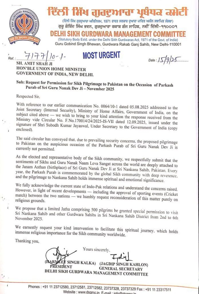 नई दिल्ली 16 सितंबर, 2025:दिल्ली सिख गुरुद्वारा प्रबंधक कमेटी (डीएसजीएमसी) के अध्यक्ष सरदार हरमीत सिंह कालका ने आज जारी एक बयान में नवंबर में पाकिस्तान के गुरुद्वारा ननकाना साहिब में गुरु नानक देव जी के प्रकाश पर्व समारोह में सिख प्रतिनिधिमंडल नहीं भेजने के केंद्र सरकार के फैसले पर गंभीर चिंता व्यक्त की।