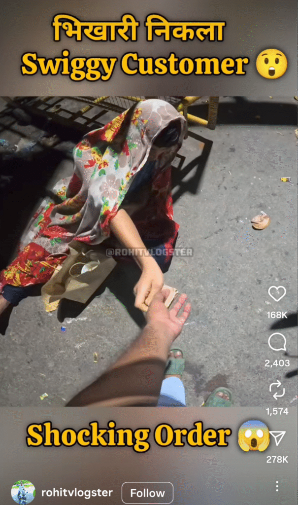 आज के समय के दौरान कौन क्या कर रहा है इसका आप अंदाजा नहीं लगा सकते खाने का मतलब की अगर कोई सड़क पर भिखारी बैठा है तो आप यह नहीं सुन सकते कि वह क्या मंगवा रहा है क्या फिर क्या काम कर रहा है एक ऐसा ही वीडियो सोशल मीडिया पर खूब वायरल हो रहा है जो की इंस्टाग्राम ब्लॉगर रोहित vlogster नाम से अकाउंट चलने वाले लड़के ने शेयर किया है जिसमें वह स्विग्गी की डिलीवरी कर रहा है और जब वह डिलीवरी देने के लिए पहुंचता है तो सामने उसे कोई नहीं दिखाई देता लेकिन जब वह फोन करता है कि आपका ऑर्डर आ चुका है तो सड़क पर बैठा भिखारी बोलता है कि यह आर्डर उसने मंगवाया है हालांकि उसने जब पैसे अपनी पेट में अलग-अलग जगह से निकले तो डिलीवरी करने वाला लड़का भी हैरान था साथ ही जो पैसे कुछ वापस करने थे वह भी दीपक रूप में भिखारी से ही दे दिए इस वीडियो के ऊपर लगातार लोगों की प्रतिक राज सामने आ रही है जिसमें कुछ लोग मजे ले रहे हैं तो कुछ सवाल पड़े कर रहे हैं।