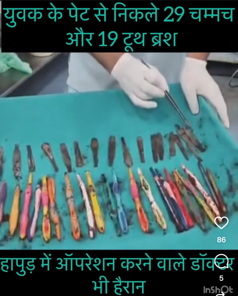 उत्तर प्रदेश के हापुड़ से एक बेहद ही हैरान करने वाला मामला सामने आया है. पेट में तेज दर्द की शिकायत के बाद एक युवक को अस्पताल में भर्ती कराया गया, जहां डॉक्टरों ने जब उसकी जांच की तो उनके होश उड़ गए. युवक के पेट से एक-दो नहीं, बल्कि 29 स्टील की चम्मचें और 19 टूथब्रश निकाले गए. यह सुनकर डॉक्टर भी दंग रह गए. यह चौंकाने वाला मामला हापुड़ के देव नंदिनी अस्पताल का है. बुलंदशहर का रहने वाला 35 साल का सचिन नशे का आदी था, जिससे उसके परिजन परेशान थे. परिजनों ने उसे नशामुक्ति केंद्र में भर्ती कराया, लेकिन सचिन को यह बात पसंद नहीं आई. गुस्साए सचिन ने नशामुक्ति केंद्र में रहते हुए स्टील की चम्मचें और टूथब्रश खाना शुरू कर दिया. सचिन ने बताया कि उसे नशामुक्ति केंद्र में खाना भी कम मिलता था, जिससे भी वह परेशान था।