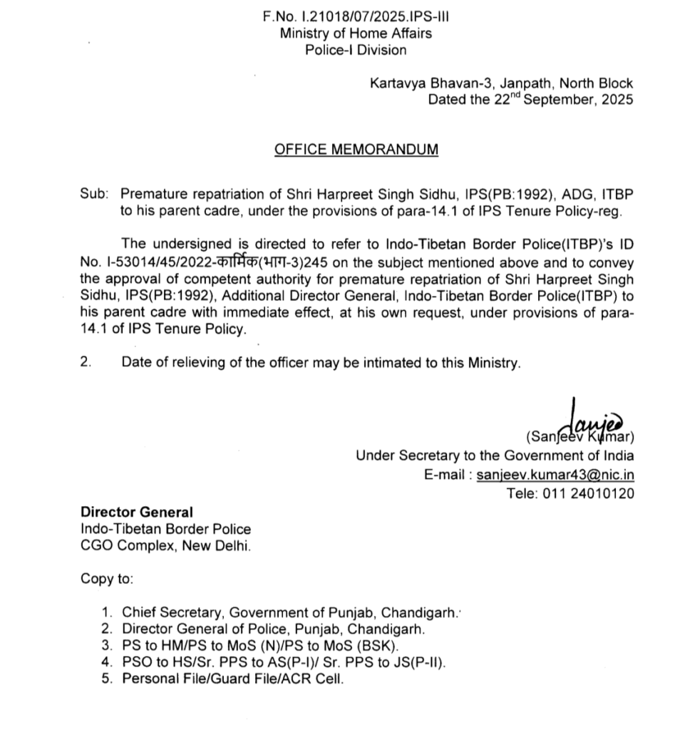 चंडीगढ़: सीनियर आईपीएस ऑफिसर हरप्रीत सिंह सिद्धू की अचानक पंजाब वापसी हो गई है जिसमें अब चर्चा जोरों पर है कि पंजाब सरकार बड़ी जिम्मेदारी दे सकती है। आपको बता दें की वह इस समय आईटीबीपी के एडीजी हैं इसके अलावा अलग-अलग पदों पर पंजाब सहित देश में जिम्मेदारी निभा चुके हैं।